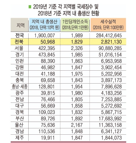 [전북일보] 지역내 총생산·국세 납부액 ‘최하위권’(1면, 2면, 김윤정)