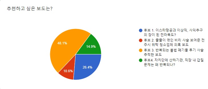 4개의 이달의 좋은 기사 후보 중 KBS전주총국 오정현 취재기자 / 김동균 촬영기자의 <반복되는 불법 폐기물 투기 사슬 추적한 보도>가 48.1%로 2020년 7월의 좋은 기사로 선정되었음을 밝힙니다.