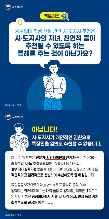 이와 별개로 보건복지부가 해명을 한다면서 24일 배포한 자료가 더 큰 논란이 됐습니다. 아직 확정되지 않은 사안을 두고 전문가와 시민사회단체 관계자가 참여하는 위원회가 학생들을 추천한다는 내용을 발표했기 때문입니다. 이와 관련 전북일보는 “보건복지부가 원인을 제공한 것이 아니냐. 결정되지 않은 제도와 정책 발표는 신중해야 한다”는 김성주 의원의 질의 내용과 “해명하는 과정에서 정확한 정보를 제공하지 못했다”는 김강립 보건복지부 차관의 답변도 전달했습니다.