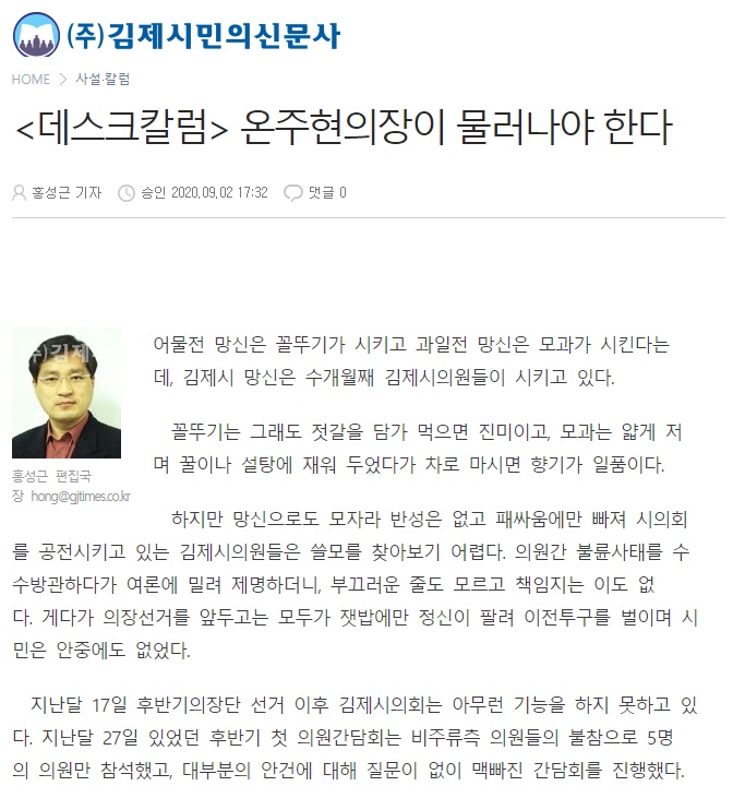 3. 데스크칼럼 - 온주현의장이 물러나야 한다(8/28, 3면, 홍성근 편집국장)
