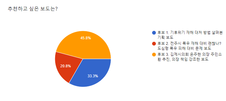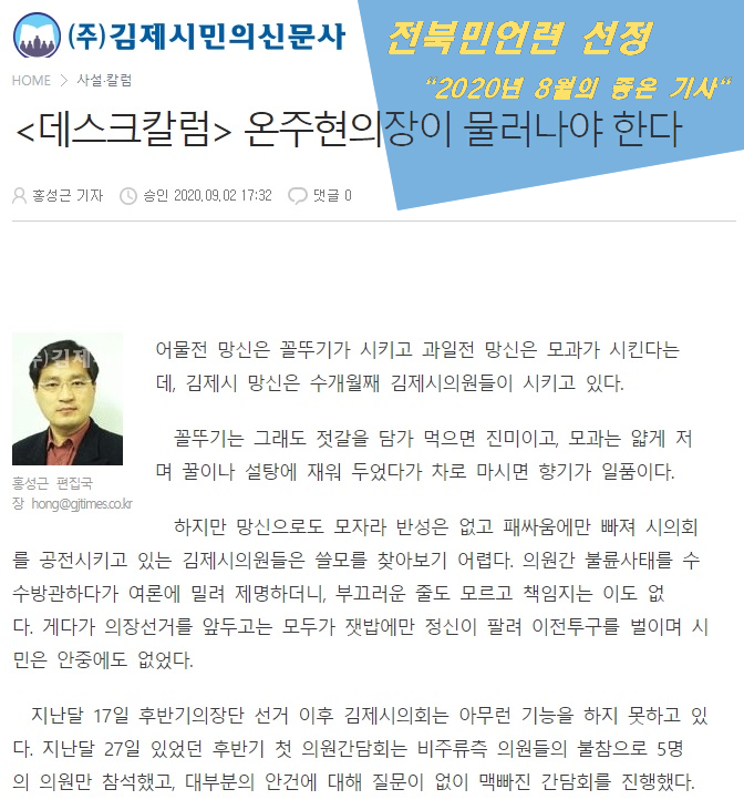 3개의 이달의 좋은 기사 후보 중 김제시민의신문 홍성근, 남성훈 취재기자의 <김제시의회 온주현 의장 주민소환 추진, 의장 책임 강조한 보도>가 45.8%로 2020년 8월의 좋은 기사로 선정되었음을 밝힙니다.
