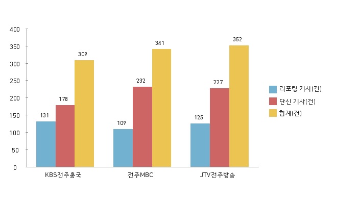 | 방송사 | 리포팅 기사(건) | 단신 기사(건) | 합계(건) |