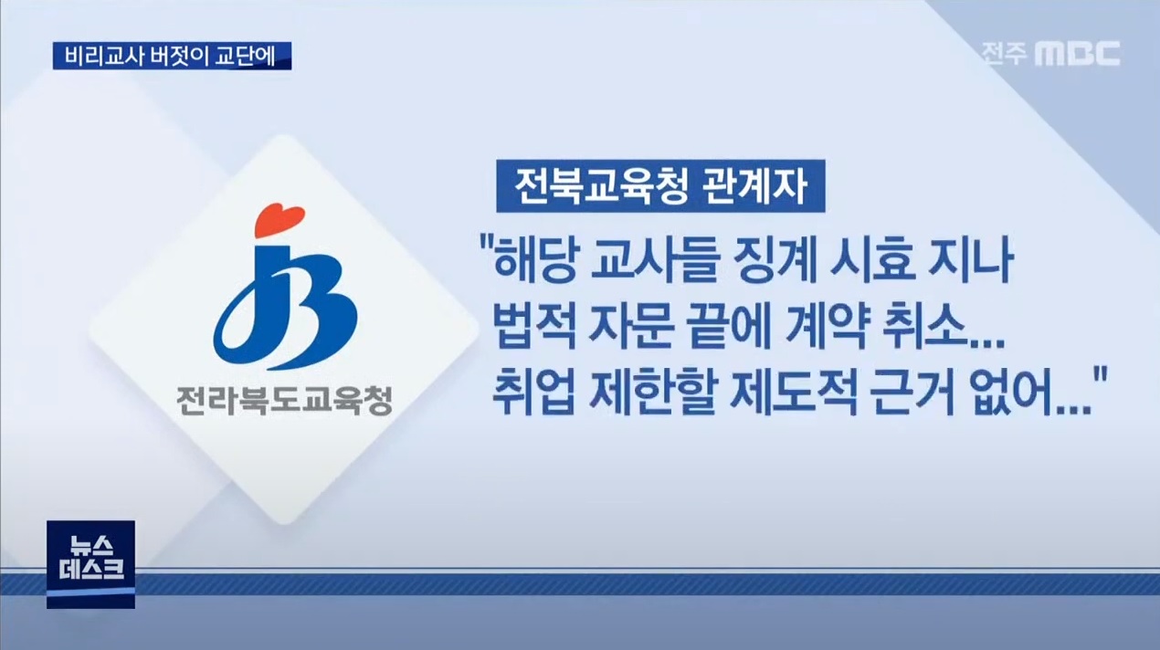 징계시효가 지나 재임용이 불가능한 ‘파면’, ‘해임’ 징계를 할 수 없어 ‘임용 취소’를 했는데, 현행법상 재취업에 아무런 제한이 없었기 때문입니다. 또 완산학원에서 퇴출된 기간제 교사는 따로 명단을 만들어 취업 대상에서 제외했지만 정규직이었던 교사는 그런 제한이 없었다는 사실도 보도했습니다.