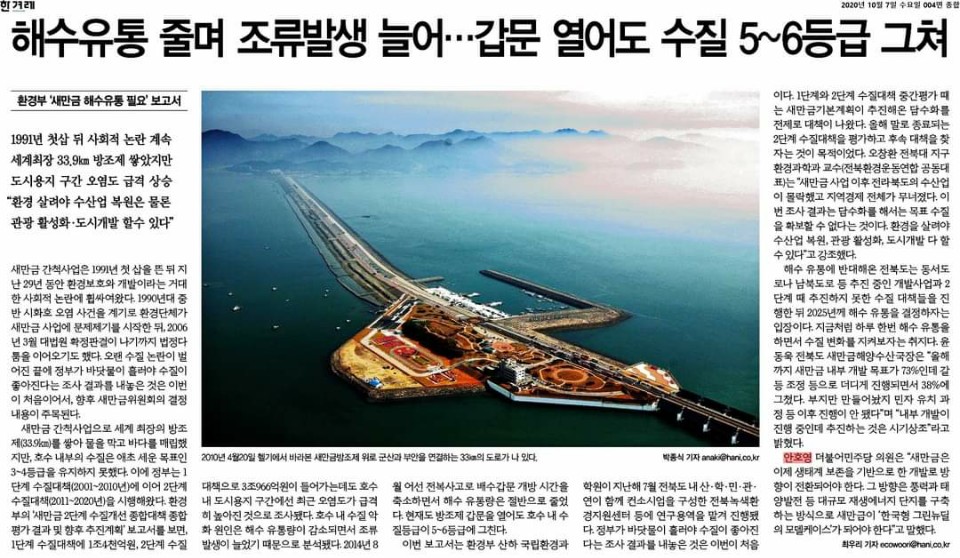 [한겨레] [단독] 29년 갈등 끝에…정부 “새만금, 바닷물 흘러야 산다”(10/7, 최우리)