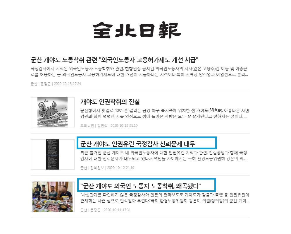 [전북일보] “군산 개야도 외국인 노동자 노동착취, 왜곡됐다”(10/12, 문정곤)