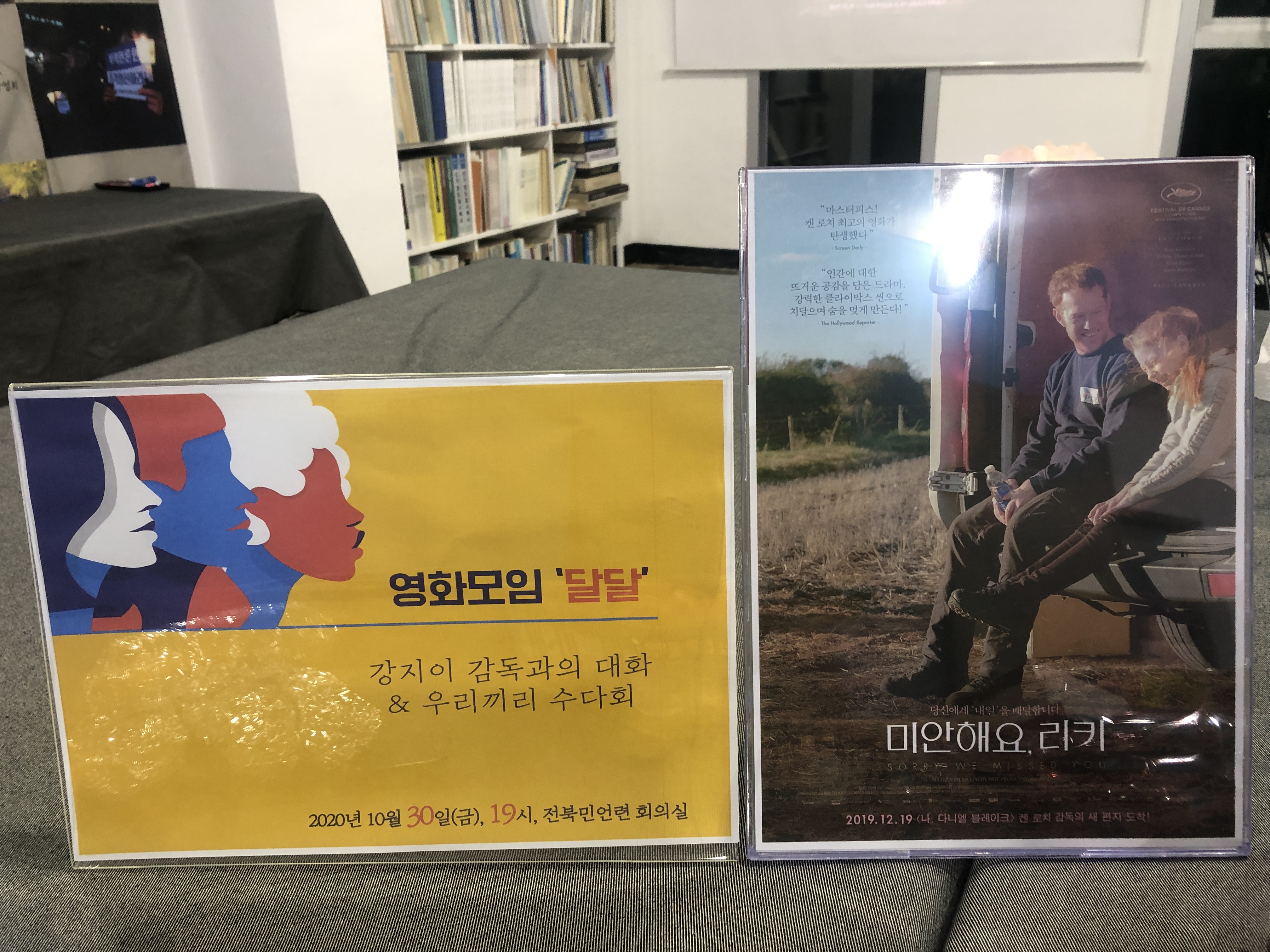 영화를 보고 이야기를 나누면서 우선 "포스터에 속았다"라는 생각이 들었습니다. 영화의 주제는 강렬하게 전달했지만 어려움을 이겨내는 감동적인 영화가 아닌 처음부터 끝까지 비극만 보여주는 슬픈 영화였기 때문입니다. 엔딩 후 리키 가족이 어떻게 됐을지를 두고도 결국 행복하게 살았을 것이다란 의견과 결국 파국을 맞았을 것이다라는 의견이 엇갈렸습니다. 또한 최근 이어지고 있는 택배회사 노동자들의 과로사 문제에 대해서도 많은 이야기가 오고 가며 이야기꽃을 피웠습니다.