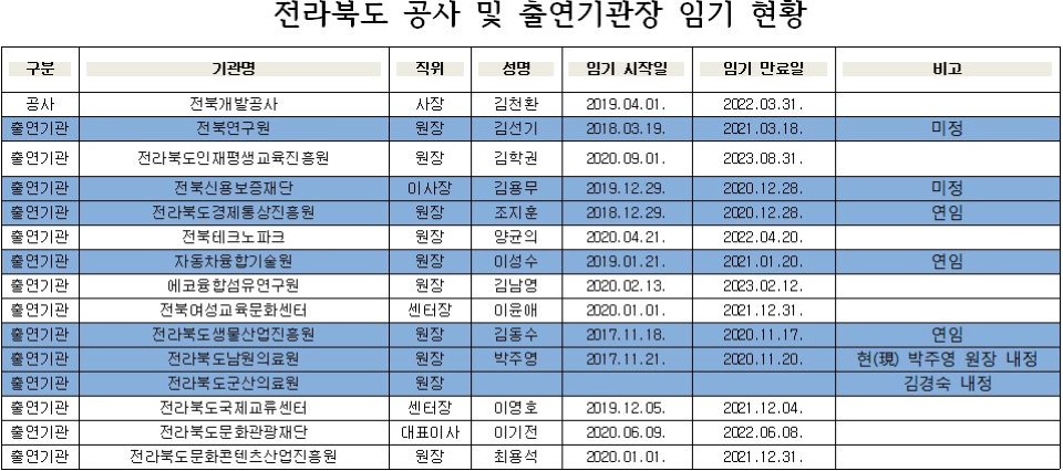 지난 3일 전북일보는 임기 종료를 앞둔 전라북도 출연기관이 다섯 곳이라며, 연임이 정해지지 않은 곳은 온갖 추측과 하마평이 나온다고 보도했습니다. 전북일보는 특히 차기 신용보증재단 이사장이 누가 될 것인지 주목하고 있습니다. 김용무 이사장이 송하진 도지사의 측근으로 알려졌고, 세 번이나 연임을 했지만 이번에는 퇴임 의사를 밝혔기 때문입니다. 기자는 아무리 송하진 도지사라도 도의회의 비판을 감수해가며 네 번이나 연임시키기는 쉽지 않았을 것이라고 분석했습니다. 전북일보가 정리한 각 출연기관장의 현황은 다음과 같습니다.