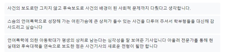KBS전주총국은 이번 사건이 얼마나 심각한 학대인지 전문가의 의견을 듣고, 언어폭력 또한 마음에 큰 상처를 주는 행동이지만 처벌을 받는 경우가 적은 점, 아동학대 범죄특례법 상 정서적 폭력의 기준이 모호하다는 점도 지적했습니다. 전주, 군산, 익산, 남원 외에는 도내에 아동보호전문기관이 없어 학생들이 아동학대에 취약하다는 점도 문제점으로 보도했습니다.