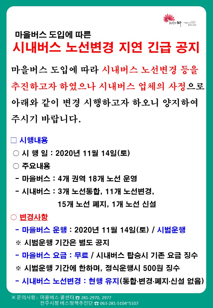 지난 13일 전주시는 14일부터 마을버스 ‘바로온’의 운행을 시작하고, 동시에 전주 시내버스 노선을 개편한다고 대대적으로 홍보했습니다. 기존 전주시 외곽지역 노선을 시내버스 대신 저렴한 마을버스가 다니며 환승 승강장까지 운행한다는 계획입니다.