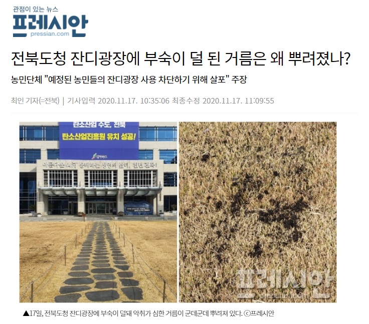 [프레시안] 전북도청 잔디광장에 부숙이 덜 된 거름은 왜 뿌려졌나?(11/17, 최인)