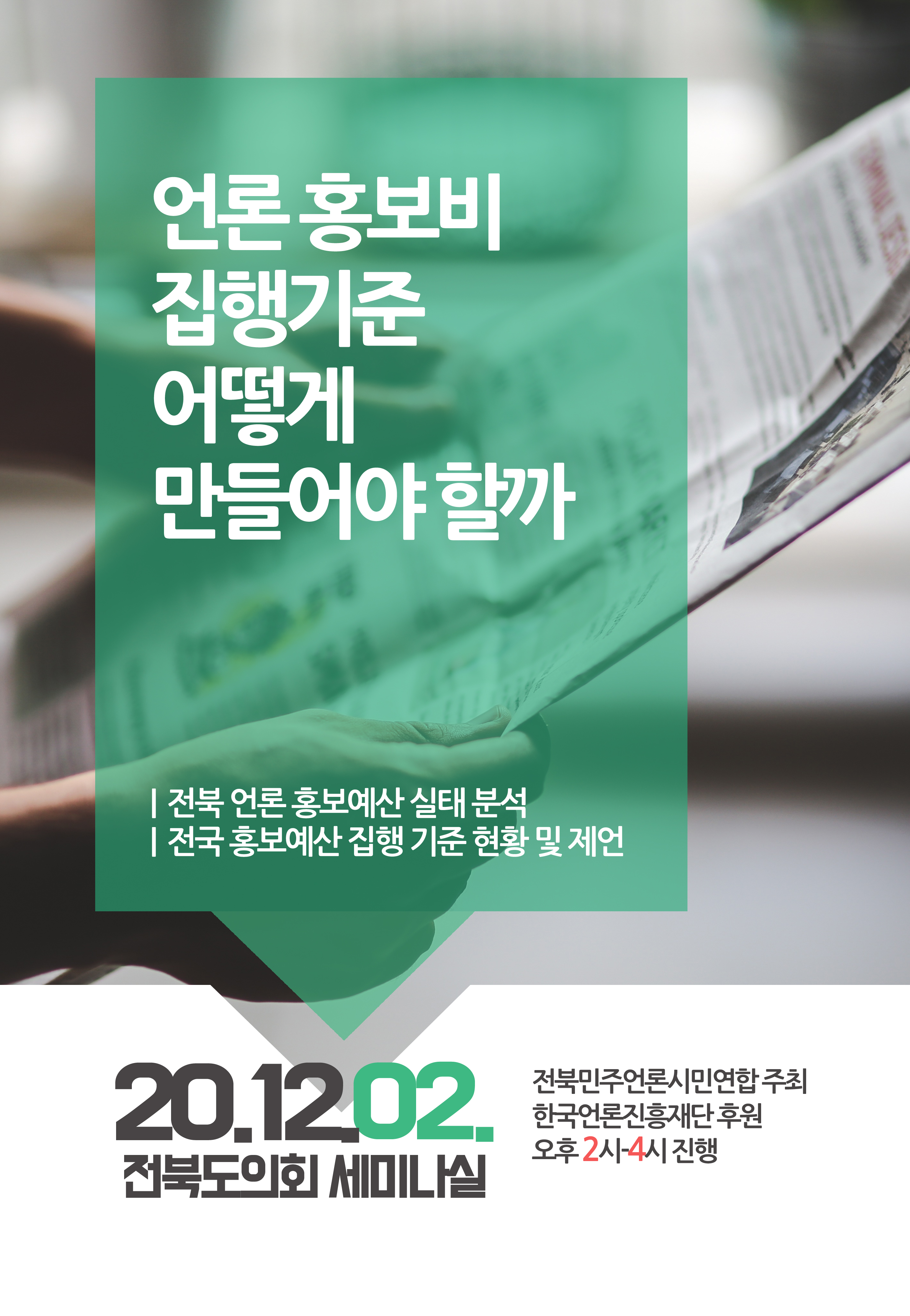 지난 12월 2일 수요일에 전북도의회 세미나실에서 '언론 홍보비 집행기준을 어떻게 만들어야 할까'라는 주제로 토론회를 진행했습니다. 코로나19로 인한 많은 분들의 참석이 어려워 전북민언련 유튜브 채널을 통한 온라인 생중계를 진행했으며, 아래 링크를 통해 영상을 보실 수 있습니다.