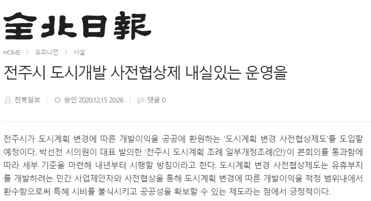 [전북일보] 전주시 도시개발 사전협상제 내실있는 운영을(12/16, 11면, 사설)