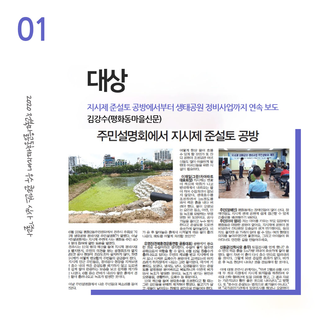 대상 | 김강수(평화동마을신문) | 지시제 준설토 공방에서부터 생태공원 정비사업까지 연속 보도 |