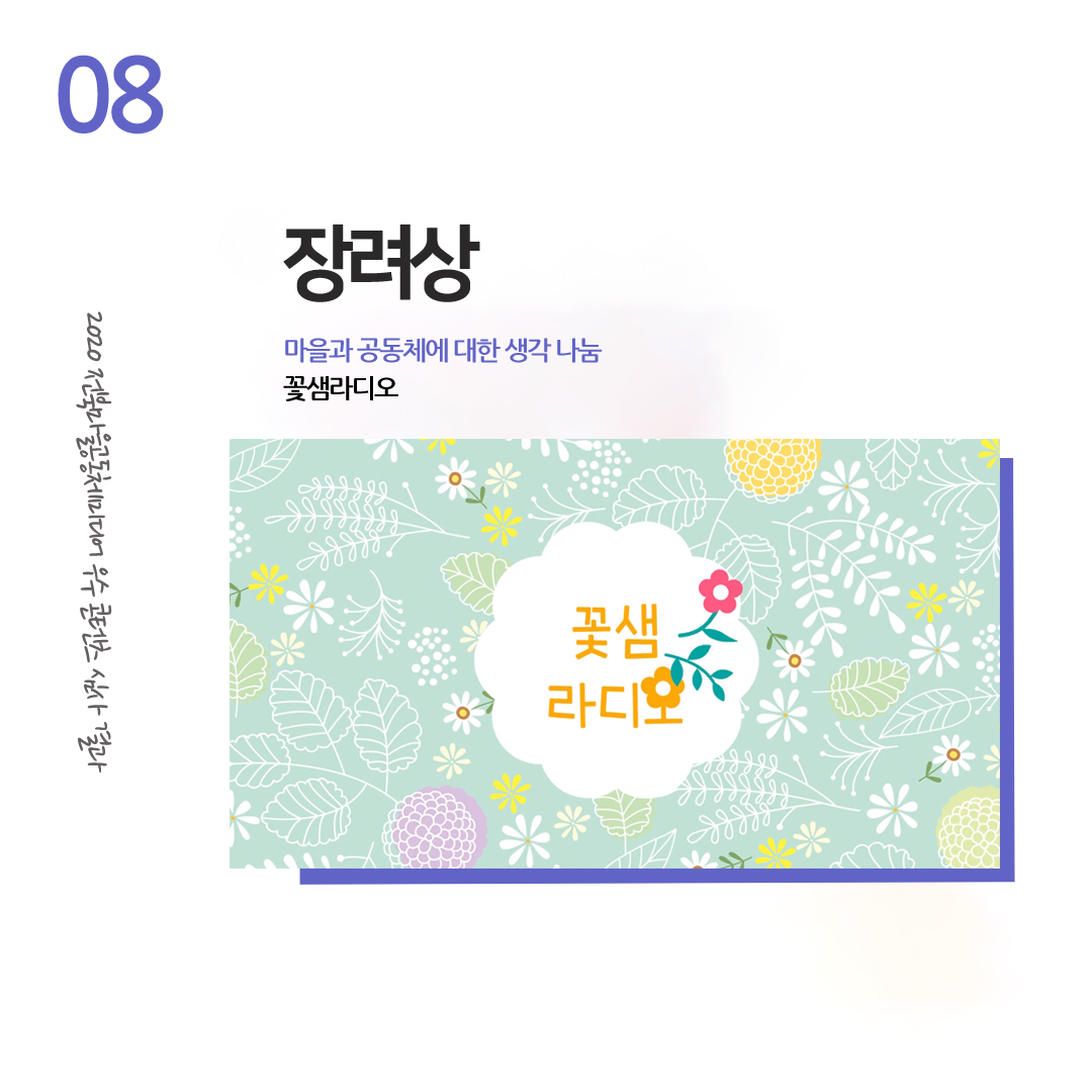 이번에 출품된 작품들만 봐도 그렇습니다. 독서 논평이나 그림책 만들기와 같은 개인적 관심사에서부터 동네의 길고양이를 기록하거나 관광 안내를 하기도 합니다. 청년들이 모여 수다를 떠는가 하면, 마을 어르신들이 잊히고 있는 고향의 이야기를 풀어놓기도 합니다. 주류 미디어에서는 다루지 않는 마을 앞 하천의 생태나 방치된 변전소 부지 활용방안과 같은 공동체 의제를 발굴하기도 하고, 코로나19나 4.15총선, 기본소득 문제와 지역상권 문제처럼 우리 사회 전체를 아우르는 의제를 다룰 때는 마을 주민들의 시각과 입장에서 접근합니다. 주민이 미디어가 되고 있는 겁니다.