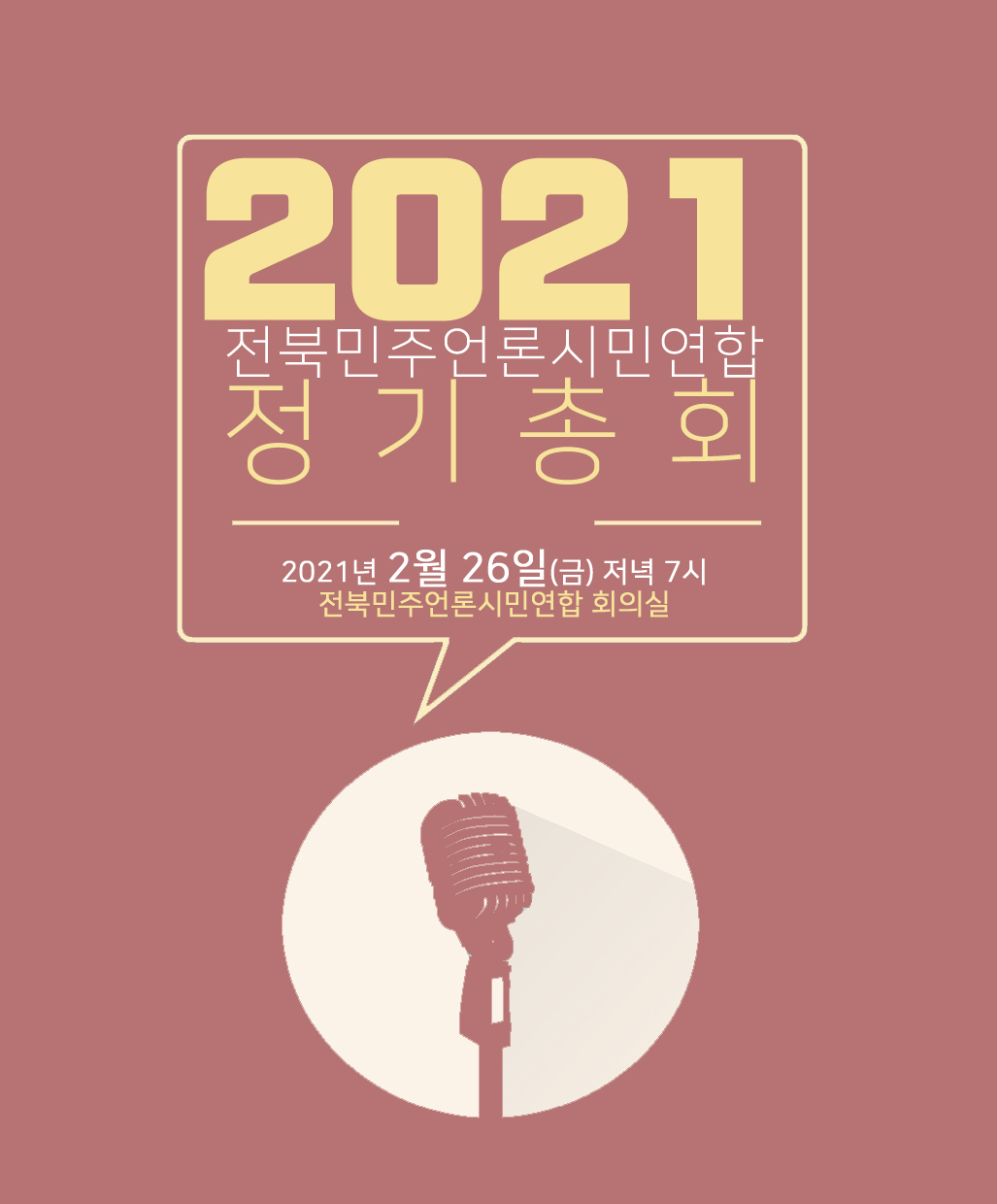 오는 2021년 2월 26일(금) 전북민언련(공동대표 김은규‧이종규) 2021 정기총회를 개최합니다. 이번 총회에서 전북민언련은 총회준비위원회(1/22일)를 거쳐 제출된 2020년 활동 보고, 2021년 사업 계획안과 예결산안, 정관 개정, 감사 선출 등을 회원들에게 승인받습니다. 많은 참여 부탁드립니다.