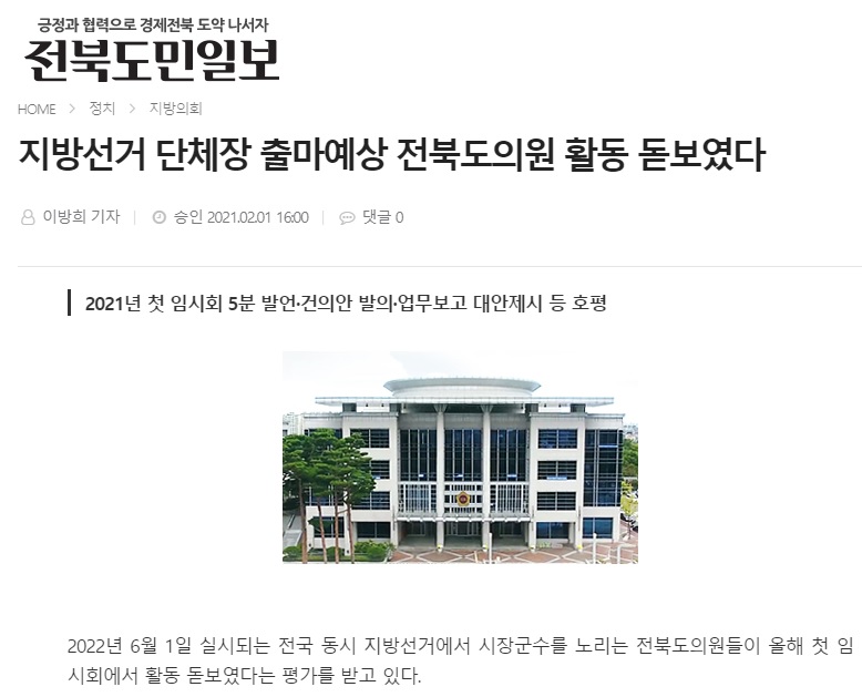 오늘 자 전북도민일보는 3면에 자치단체장 후보 출마가 예상되는 전북도의원들의 이름을 나열하며 올해 첫 임시회 활동을 두고 이들이 “열정적 질의, 대안제시 두각”을 나타냈다고 평가했습니다. 그런데 보도 내용을 살펴보니 왜 이런 평가를 했는지에 대한 명확한 근거가 없습니다.