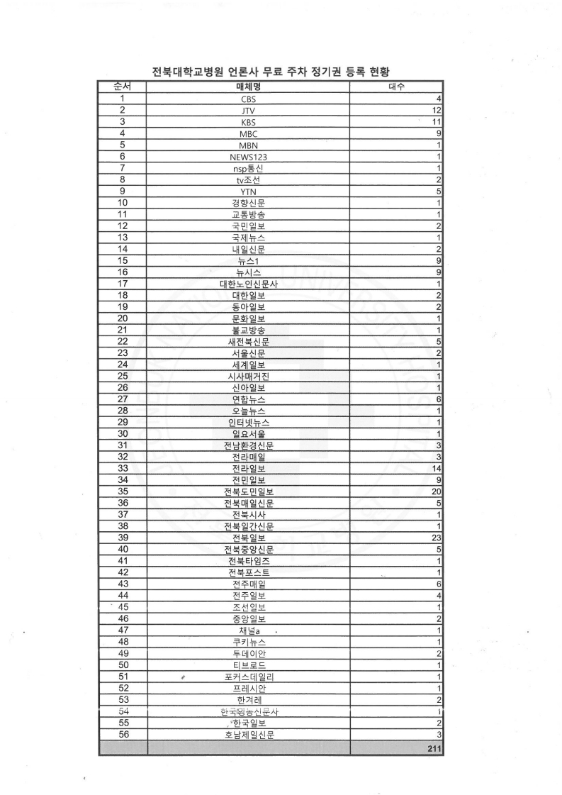 전북대학교 병원은 「주차장관리규정」 제11조를 근거로 제시하며 2020년 언론사와 기자를 대상으로 무료 주차 정기권을 총 56개 언론사 211대에 제공했다고 밝혔다. 한 언론사에만 스무 대가 넘는 차량이 무료 주차 정기권을 제공받기도 했는데 2019년 전북대학교의 경우와 유사해 무료 주차 정기권 관리가 제대로 이뤄지지 않았던 것으로 여겨진다.