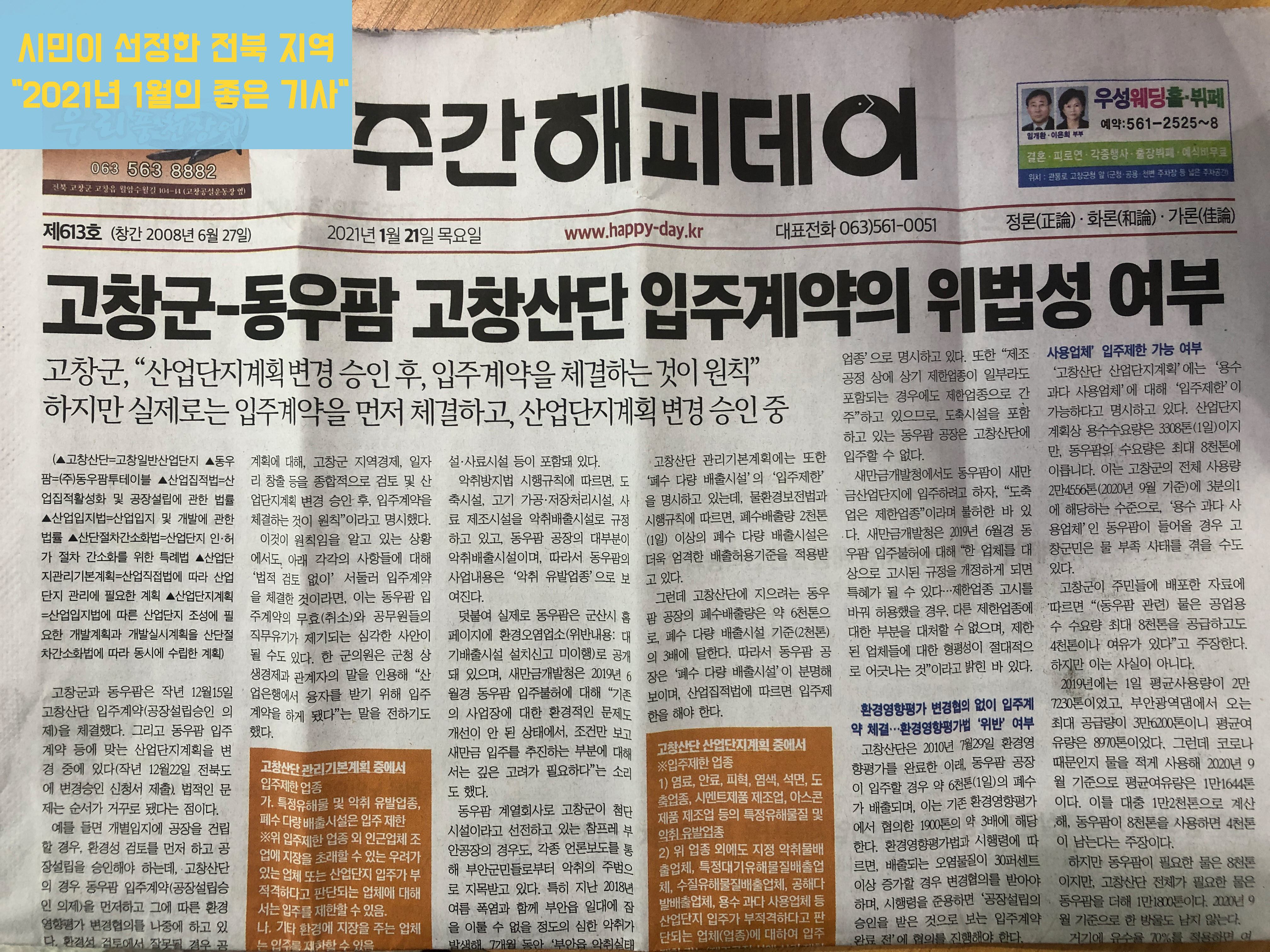 3. 고창군과 동우팜투테이블 투자협약은 위법(2020/8/13, 1면, 김동훈)