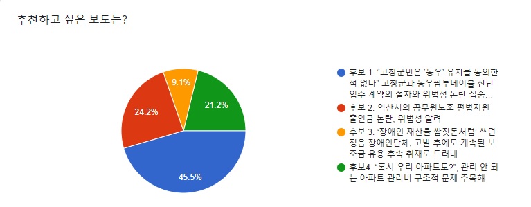 4개의 이달의 좋은 기사 후보 중 주간해피데이 김동훈 취재기자의 <“고창군민은 ‘동우’ 유치를 동의한 적 없다”, 고창군과 동우팜투테이블 산단 입주 계약의 절차와 위법성 논란 집중 취재>가 45.5%로 2021년의 첫 이달의 좋은 기사로 선정되었음을 밝힙니다.