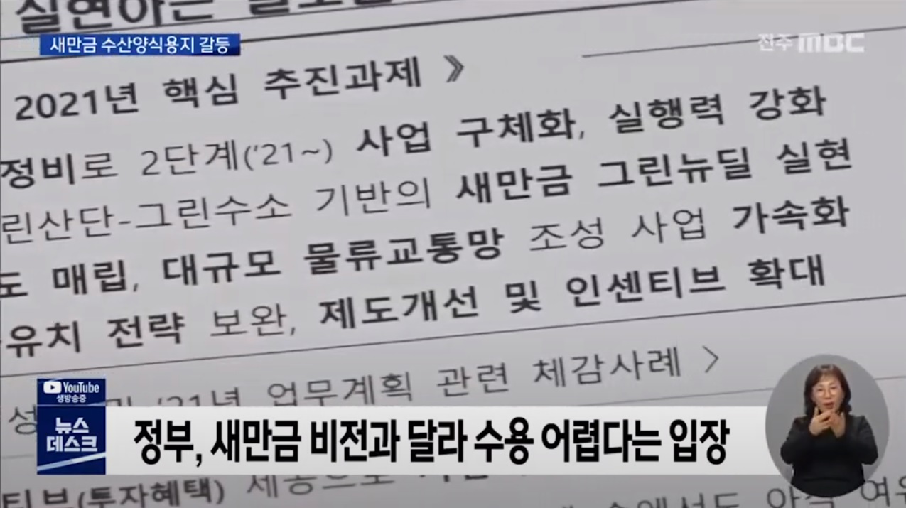 전주MBC는 수산업 대책을 촉구하는 어민들의 목소리와 관련해 새만금개발청의 입장을 전달했습니다. 양충모 새만금개발청장은 “수산양식용지는 새만금 기본계획에 담을 성격은 아닙니다. 농업용지에 담는 것이기 때문에 농림부 의견이 중요합니다. 그래서 농림부와 잘 협의를 하시라고 말씀을 드렸는데...”라고 답변했는데, 기자는 소극적인 태도라며 새만금개발청을 비판했습니다.