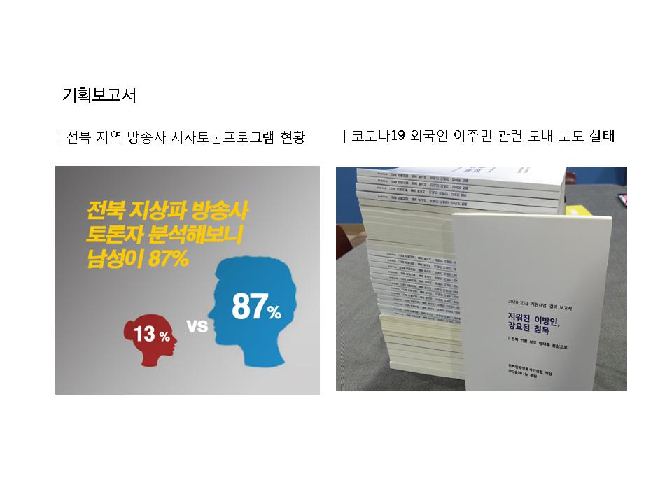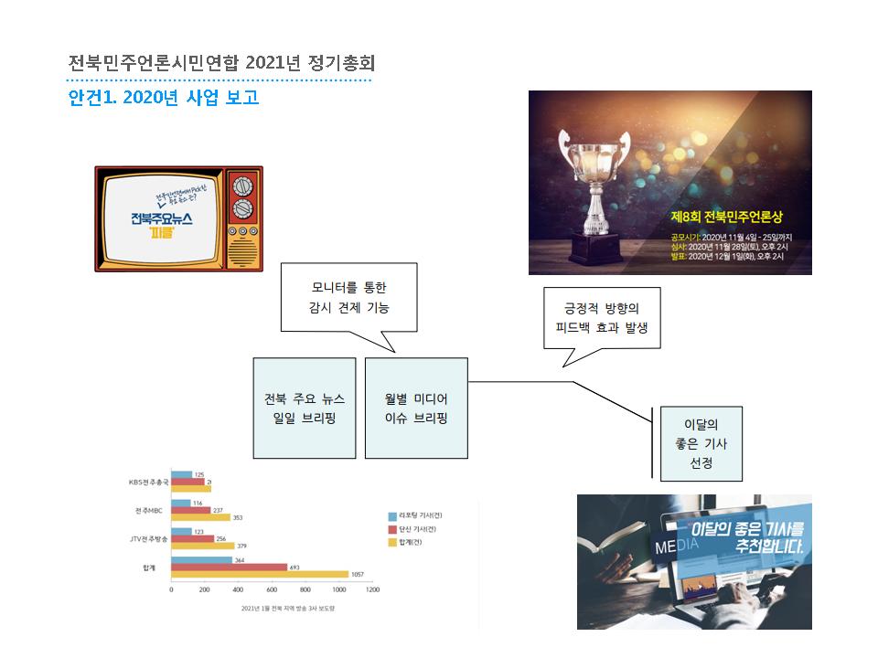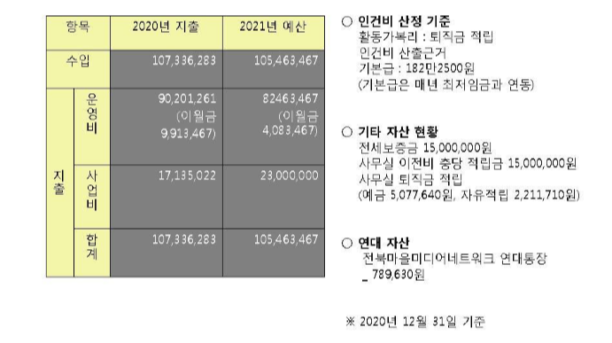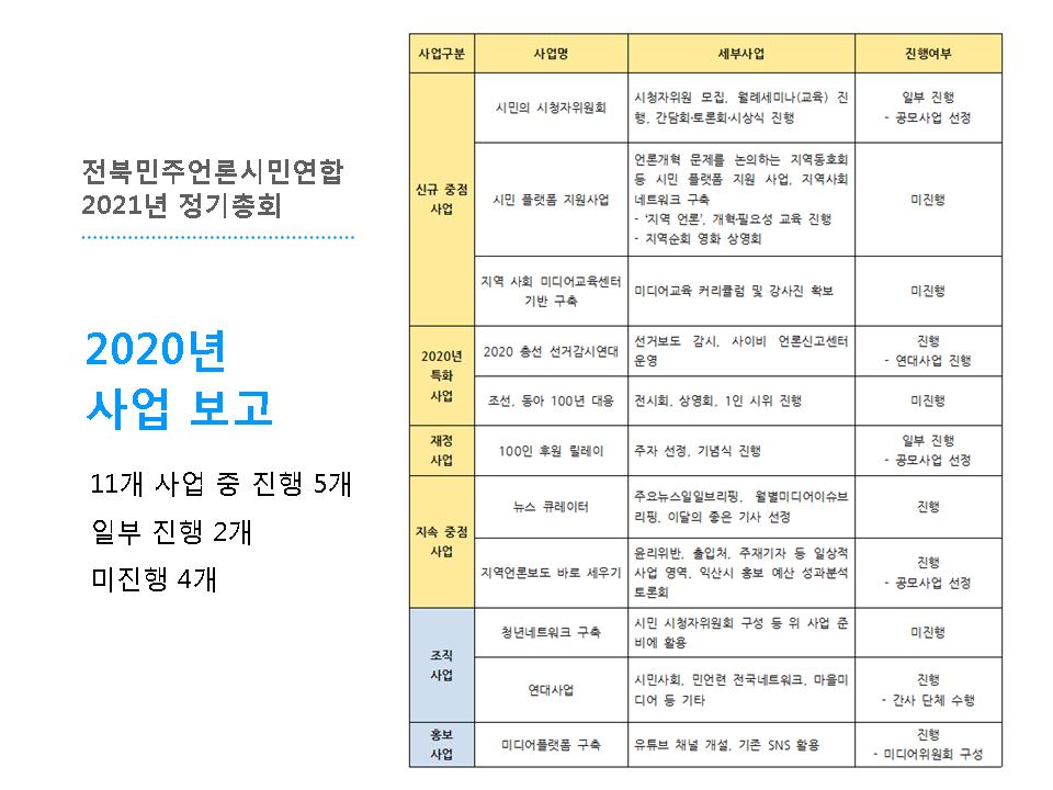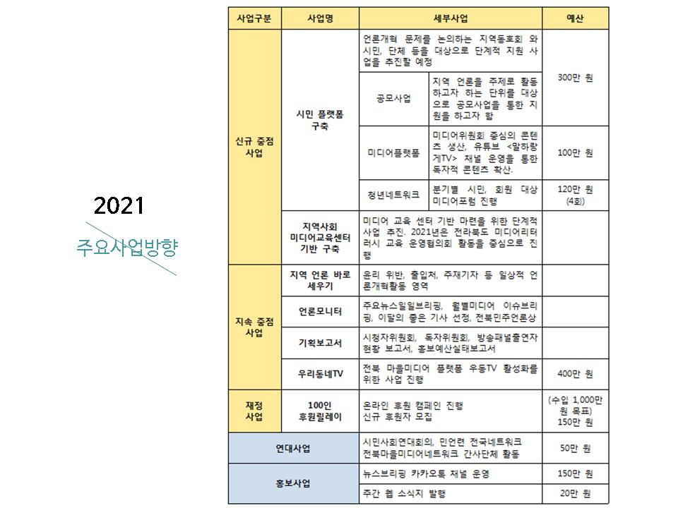 이후 2021년 사업안으로는 아래와 같은 내용이 소개되었습니다. <언론홍보예산 출입기자단 관행 개선을 위한 시군별 순회 토론회>는 한국언론진흥재단 공모사업에 선정되어 3개 지역을 선정해 순회 토론회를 2021년 진행할 예정입니다. 또한 2021년에도 <전북마을미디어네트워크>와 마을미디어플랫폼인 <우리동네TV> 운영협의회 간사단체로 활동합니다.