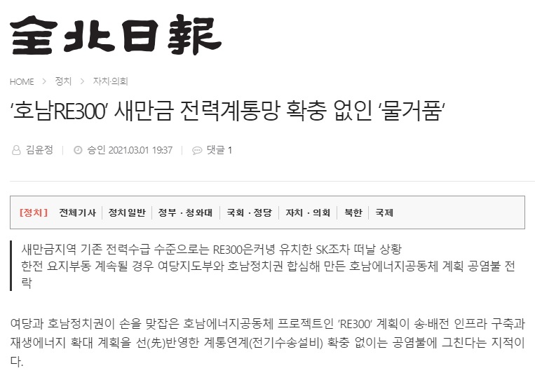 전북도민일보가 <신년대기획 - 그린뉴딜 기업 입주 시급>편에서 “SK데이터센터를 시작으로 관련 기관, 기업을 새만금에 유치하고 재생에너지 클러스터를 구축한다”는 전라북도 그린뉴딜 사업 포부를 지면에 띄웠지만, 불과 보름 전 인프라 부족으로 인한 SK 투자 난항 소식이 전북일보에 보도됐습니다. 과거 새만금 투자유치가 수차례 무산되면서 언론이 얻은 교훈은 없었던 걸까요?