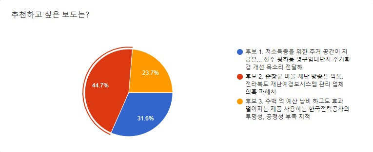3개의 이달의 좋은 기사 후보 중 전북CBS 노컷뉴스 남승현, 최명국, 송승민, 김용완 취재기자의 <순창군 마을 재난 방송은 먹통. 전라북도 재난예경보시스템 관리 업체 의혹 파헤쳐>가 44.7%로 2021년 2월의 좋은 기사로 선정되었음을 밝힙니다.