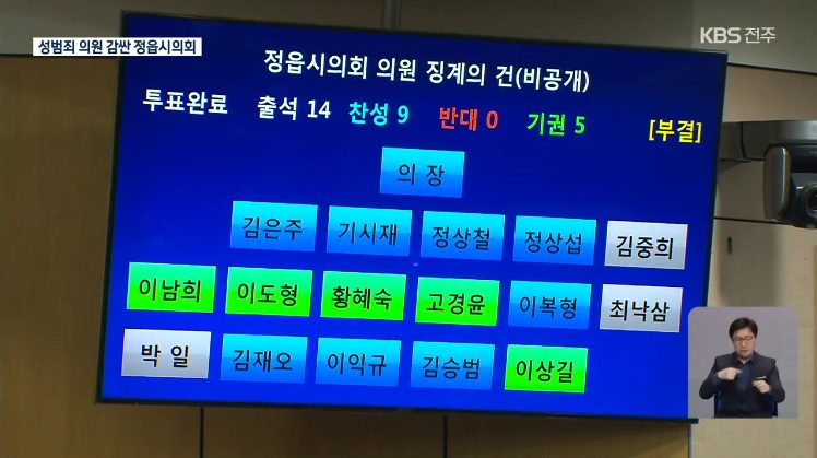 의원 제명 의결은 제적의원 중 2/3이상이 찬성해야 가결됩니다. 정읍시의회는 총 17명으로 12명 이상의 시의원이 찬성해야 하는데요, 출석한 의원 14명 중 9명이 찬성했지만 5명이 기권해 제명 안건이 부결됐습니다. 투표 결과는 다음과 같습니다.