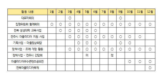 그리고 많은 마을미디어 단체에서 필요성을 강조한 네트워크 단체들간의 친목을 위한 여러 형태의 소모임을 진행해 보고자 합니다. 대략적인 연간 일정표는 아래와 같아요.