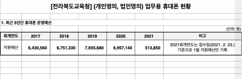NPO주민참여가 공개한 자료에는 전라북도교육청의 휴대전화 요금 지원 현황도 포함이 되어 있었습니다. 최근 5년 동안 김승환 전북교육감을 포함한 교육청 소속 공무원 8명(교육감, 교육감 비서관, 교육감 수행비서, 교육감 운전기사, 부교육감, 부교육감 수행비서, 부교육감 운전기사, 교육국장)에게 약 2800만 원의 휴대전화 요금을 지원했습니다.