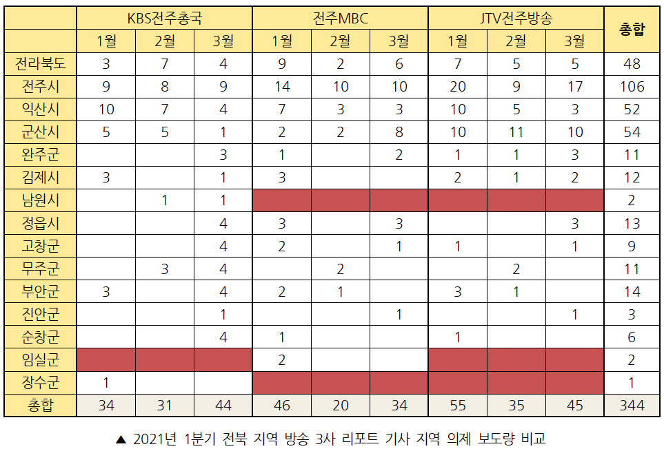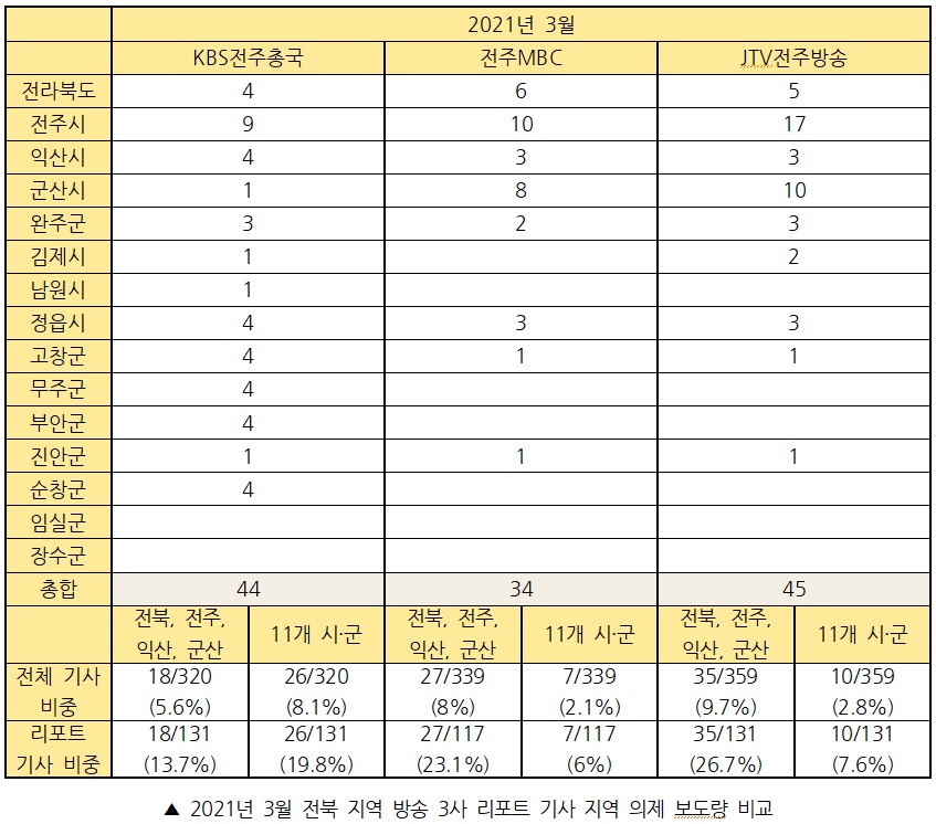 2021년 1분기 전북 지역 방송 3사의 리포트 기사 지역 의제 보도량은 총 344건으로 나타났다. 이 중 전북, 전주, 익산, 군산 지역 의제 보도량은 260건(75.6%)으로 나머지 11개 시·군 84건(24.4%)와 큰 차이를 보였다. 3개월 동안 세 방송사 통틀어 장수군 1건, 남원시·임실군 2건, 진안군 3건으로 나타나는 등 지역별 격차도 심각하다.