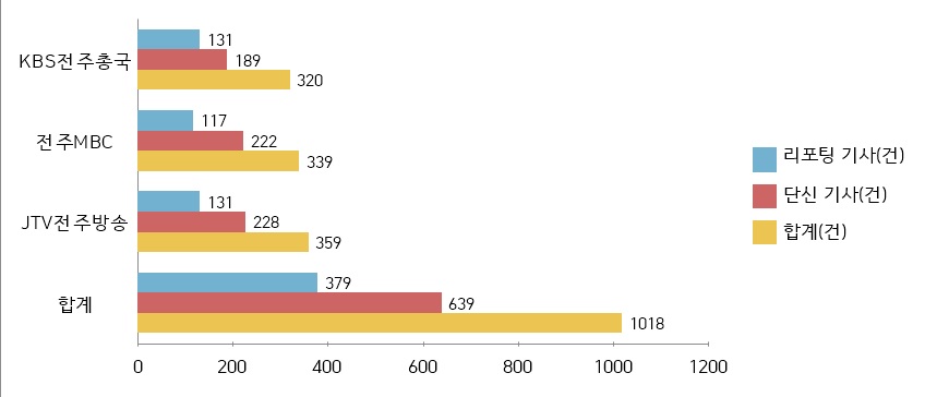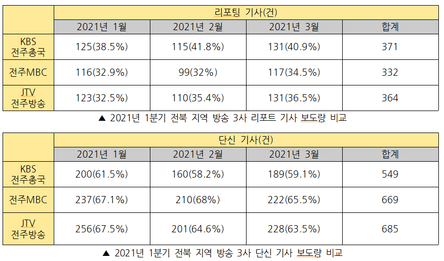 2021년 3월 전북 지역방송 3사 보도량은 리포트 기사 379개(37.2%), 단신 기사 639개(62.8%)로 총 1018건이다. 각 방송사별로 살펴보면 다음과 같다.