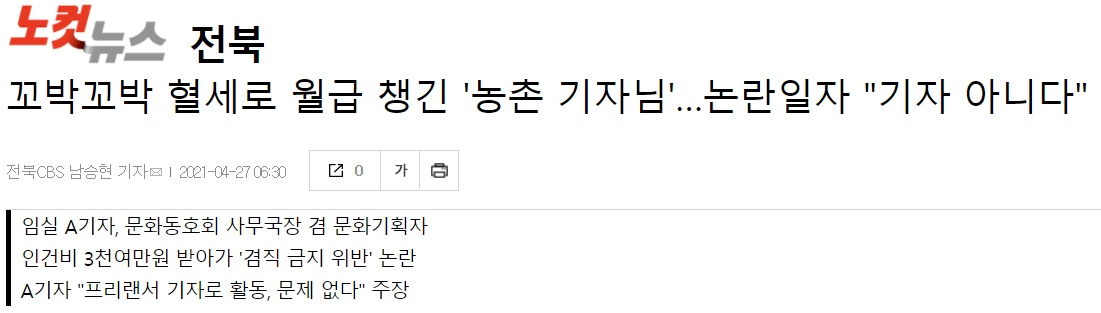 [전북CBS] 꼬박꼬박 혈세로 월급 챙긴 '농촌 기자님'…논란일자 "기자 아니다"(4/27, 남승현)