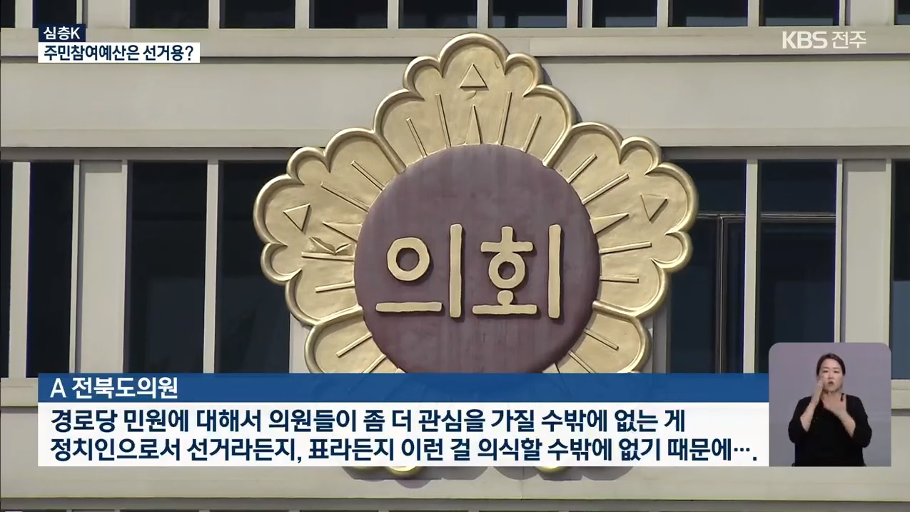 KBS전주총국은 지난 3월 경로당 방진망 선공사 논란으로 시작된 ‘주민도 모르는 주민참여예산’, ‘이름만 바뀐 재량사업비’의 실태를 보도했습니다. 4월에도 꾸준히 보도를 이어가며, 전라북도 곳곳에서 비슷한 일들이 벌어지고 있고, 특히 경로당에 사업이 집중되고 있다는 점에 주목했습니다.