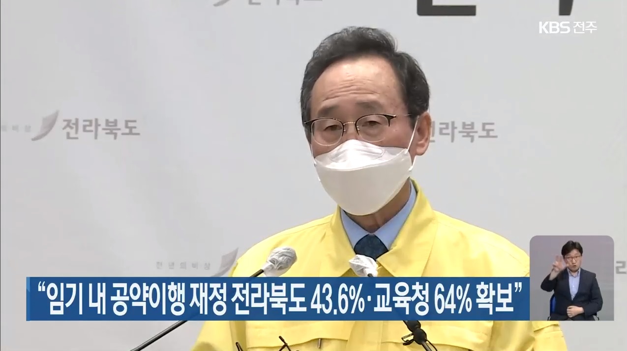 구체적으로 살펴보면 전라북도는 전체 101개 공약 중 완료·이행된 공약이 51건(완료 2건), 50.51%로 전국 평균인 61.96%보다 낮은 것으로 나타났습니다. 공약이행을 위한 재정 중 임기내 계획 총계는 6,033,802백만 원으로, 2020년 12월 말까지 2,631,433백만 원(43.61%)이 확보된 것으로 나타났는데 역시 전국 평균인 72.53%보다 낮은 수치입니다.