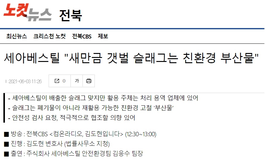 [전북CBS] 세아베스틸 "새만금 갯벌 슬래그는 친환경 부산물"(6/3, 컴온라디오 김도현입니다)