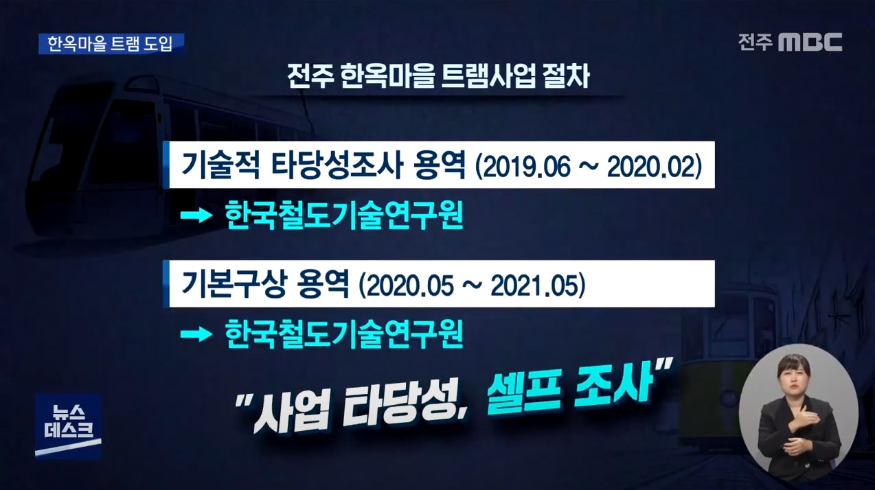 실제로 지난해 11월 3일 전북일보 보도에 따르면 전주시와 한국철도기술연구원은 ‘전주 한옥마을 관광트램 도입을 위한 MOU 체결 협약식’을 진행하고, 한국철도기술연구원이 관광 트램의 설계와 제작을 맡기로 했습니다. 전주MBC는 “한국철도기술연구원은 전주시와 함께 트램 사업을 주도하고 있는 이해당사자다. ‘셀프 조사’를 통해 사업성을 부풀려 발표한 게 아니냐는 지적이 나오는 이유”라고 보도했습니다.