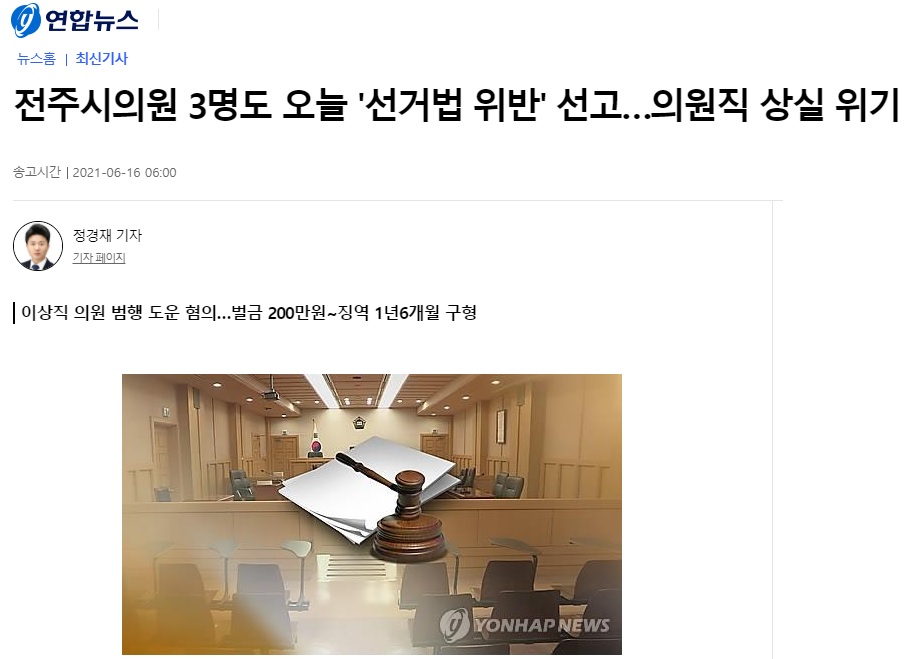 [연합뉴스] 전주시의원 3명도 오늘 '선거법 위반' 선고…의원직 상실 위기(6/16, 정경재)
