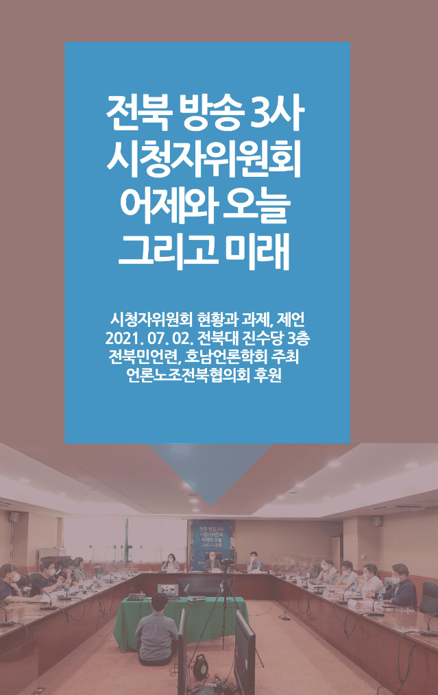 <전북 방송 3사 시청자위원회 어제와 오늘, 그리고 미래>라는 주제로 열린 시청자위원회 간담회가 지난 7월 2일 전북대학교 진수당에서 진행되었습니다. 전북민주언론시민연합과 호남언론학회가 공동 주최주관하고, 언론노조 전북협의회가 후원한 이번 토론회는 '전북 시청자위원회 어떻게 변화했나', '시청자위원이 바라본 현황은?', '더 나은 시청자위원회를 위한 제언'이라는 주제로 진행되었습니다.