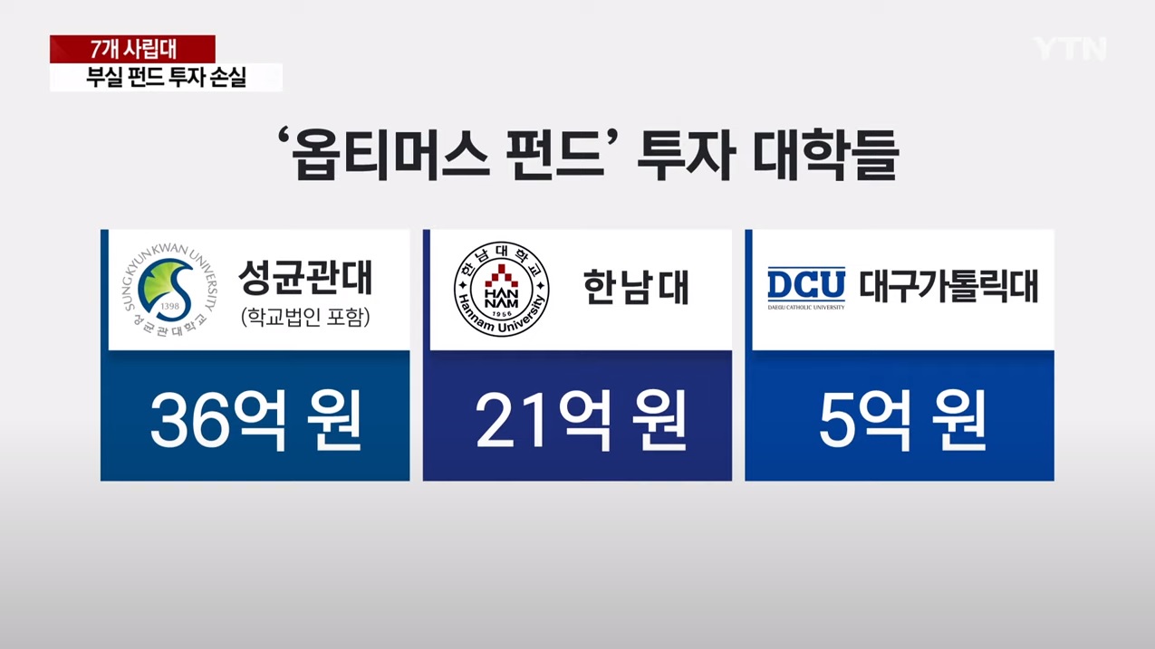 5천 6백억 원대 손실이 발생했던 옵티머스 펀드 사기 사건, 1조 6천억 원대 환매 중단 사태를 낳은 라임 펀드 사건 등 여러 사람들이 부실 펀드로 인해 피해를 입었죠. 이런 부실 펀드에 투자한 곳 중에는 사립대학교도 있었습니다. 지난 18일 YTN 보도에 따르면 옵티머스 펀드에 건국대학교가 120억 원, 성균관대가 36억 원, 한남대 21억 원, 대구가톨릭대가 5억 원씩 투자했다가 피해를 봤습니다.