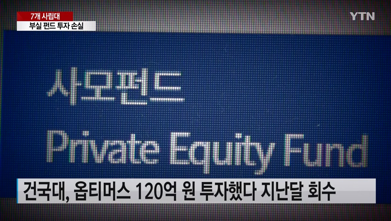 5천 6백억 원대 손실이 발생했던 옵티머스 펀드 사기 사건, 1조 6천억 원대 환매 중단 사태를 낳은 라임 펀드 사건 등 여러 사람들이 부실 펀드로 인해 피해를 입었죠. 이런 부실 펀드에 투자한 곳 중에는 사립대학교도 있었습니다. 지난 18일 YTN 보도에 따르면 옵티머스 펀드에 건국대학교가 120억 원, 성균관대가 36억 원, 한남대 21억 원, 대구가톨릭대가 5억 원씩 투자했다가 피해를 봤습니다.