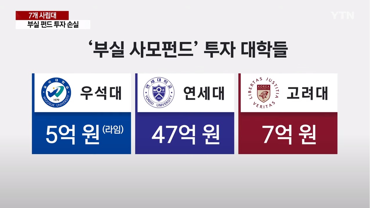 YTN은 “사립대학들의 방만한 투자는 매년 문제가 되고 있다.”라고 보도했습니다. 2019년 사립대 58곳이 유가증권에 투자한 적립금 1조 5천억 원 중 63억 원이 손해를 본 것으로 나타났기 때문입니다.