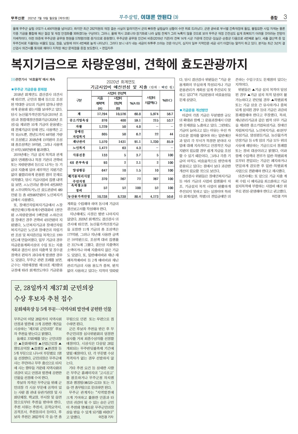 [무주신문] 각종 기금 운용도 주먹구구·비효율적 (7/19, 1면 이진경 기자)