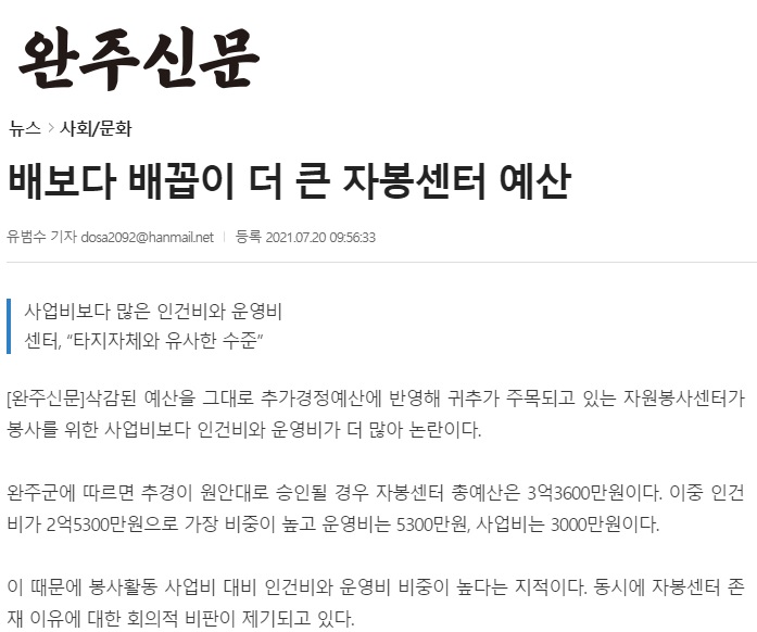 오늘 자 전북일보 보도에 따르면 22일 제261회 완주군의회 임시회에서 11명의 의원 중 3명 찬성, 5명 반대, 1명 기권, 2명 무효표로 완주자원봉사센터 인건비와 운영비를 포함한 1억 69만 9000원이 삭감됐습니다. 전북일보는 “지난해에 이어 이번 의회에서도 인건비가 삭감되면서 완주자봉 운영은 파행 우려가 커졌다.”라고 보도했고, 오늘 자 완주신문도 “자봉센터 하반기 운영은 불가능할 전망”이라고 보도했습니다.