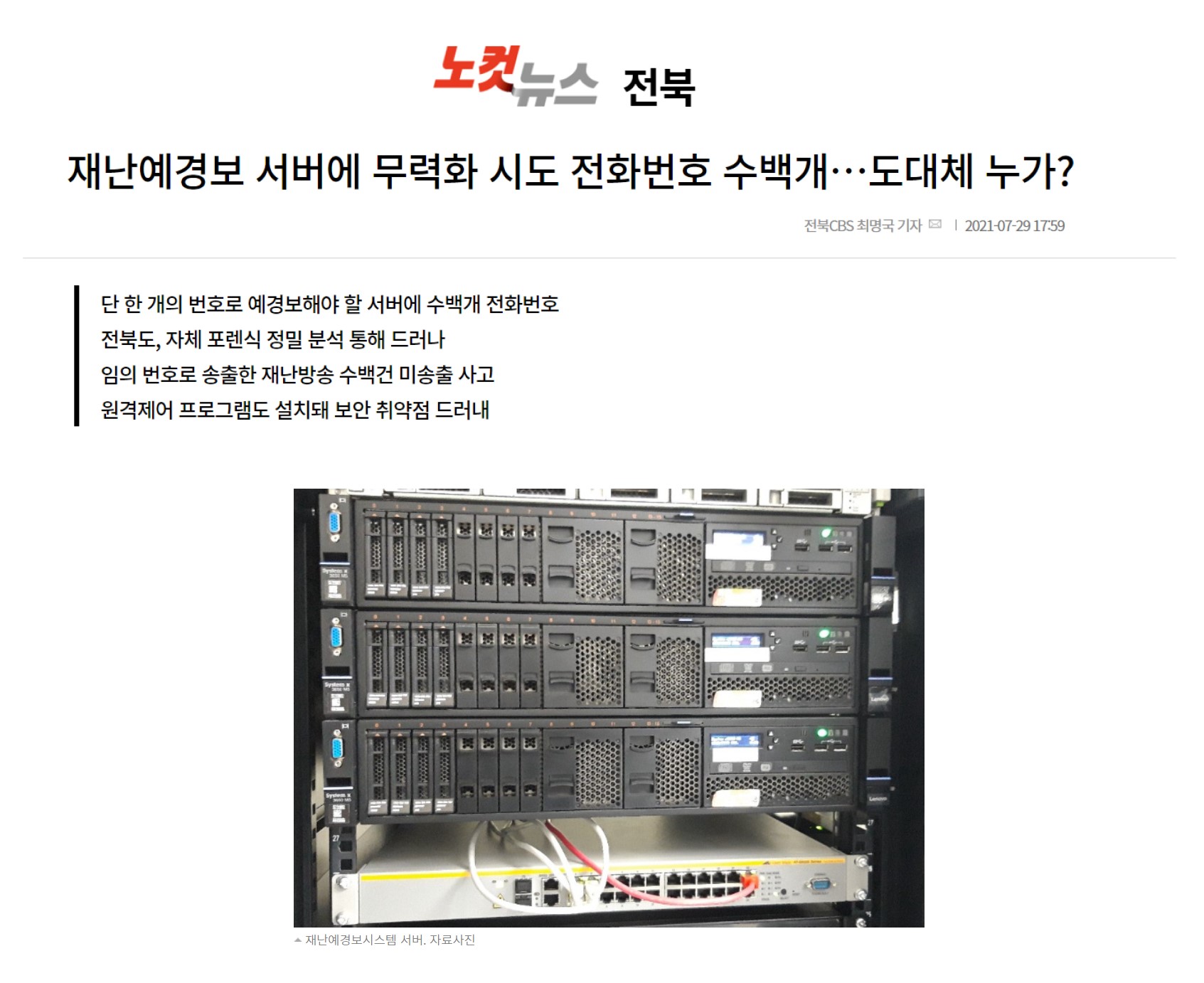 전라북도는 시·군 재난예경보 시스템의 문제점과 비리 의혹을 다룬 CBS노컷뉴스 보도와 관련해 지난 7월 19일부터 특정감사에 돌입했다고 하는데요. 전북 CBS 7월 29일 보도에 따르면 전라북도에서 진행한 재난예경보시스템 서버에 대한 자체 정밀 분석(포렌식) 결과 해당 서버에 수상한 전화번호 수백개와 원격제어 프로그램 등이 설치돼 있는 것으로 알려졌으며, 이는 단 하나의 전화번호를 통해 재난 예경보를 내려야 할 전북도 서버를 사실상 무력화할 수 있는 초유의 일이라고 기사화했습니다.