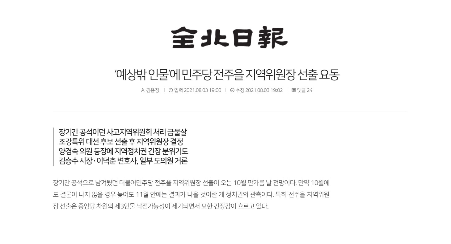 [전북일보] ‘예상밖 인물’에 민주당 전주을 지역위원장 선출 요동 (8/4, 김윤정)