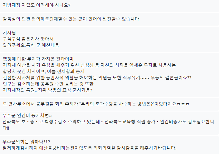투표에 참여한 시민 분들은 다음과 같이 무주군의 지방재정에 대한 걱정과 함께 지방자치단체의 예산 운용을 감시하는 역할이 필요하다는 의견을 주셨습니다.