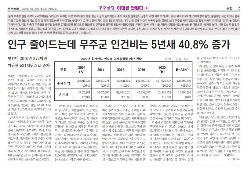 11. 인구 줄어드는데 무주군 인건비는 5년 새 40.8% 증가(7/26, 3면, 이진경 취재기자)
