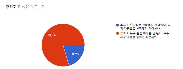 2개의 이달의 좋은 기사 후보 중 무주신문 이진경 취재기자의 <무주 살림 이대론 안 된다. 무주재정 효율성 높이는 방법은?>가 79.5%의 투표를 받아 2021년 7월의 좋은 기사로 선정되었음을 밝힙니다.