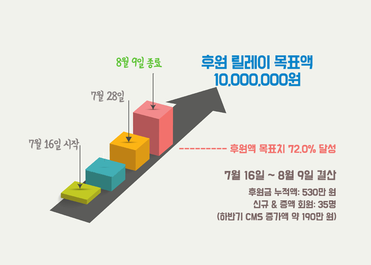 2021년 릴레이는 8월 9일 종료 결과 후원금 목표액 1000만 원에서 72% 정도 목표치를 달성했습니다.